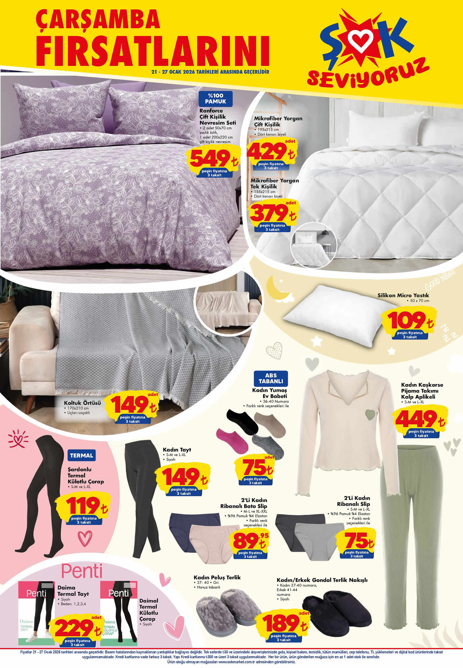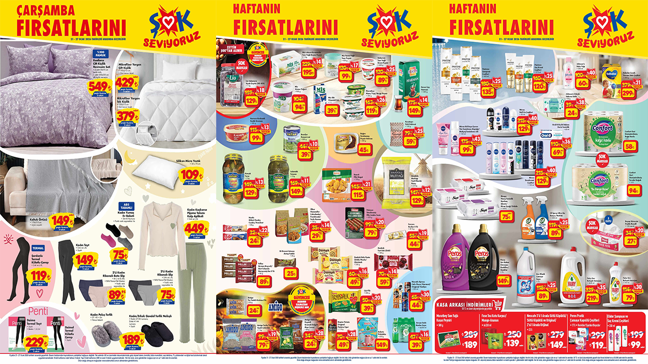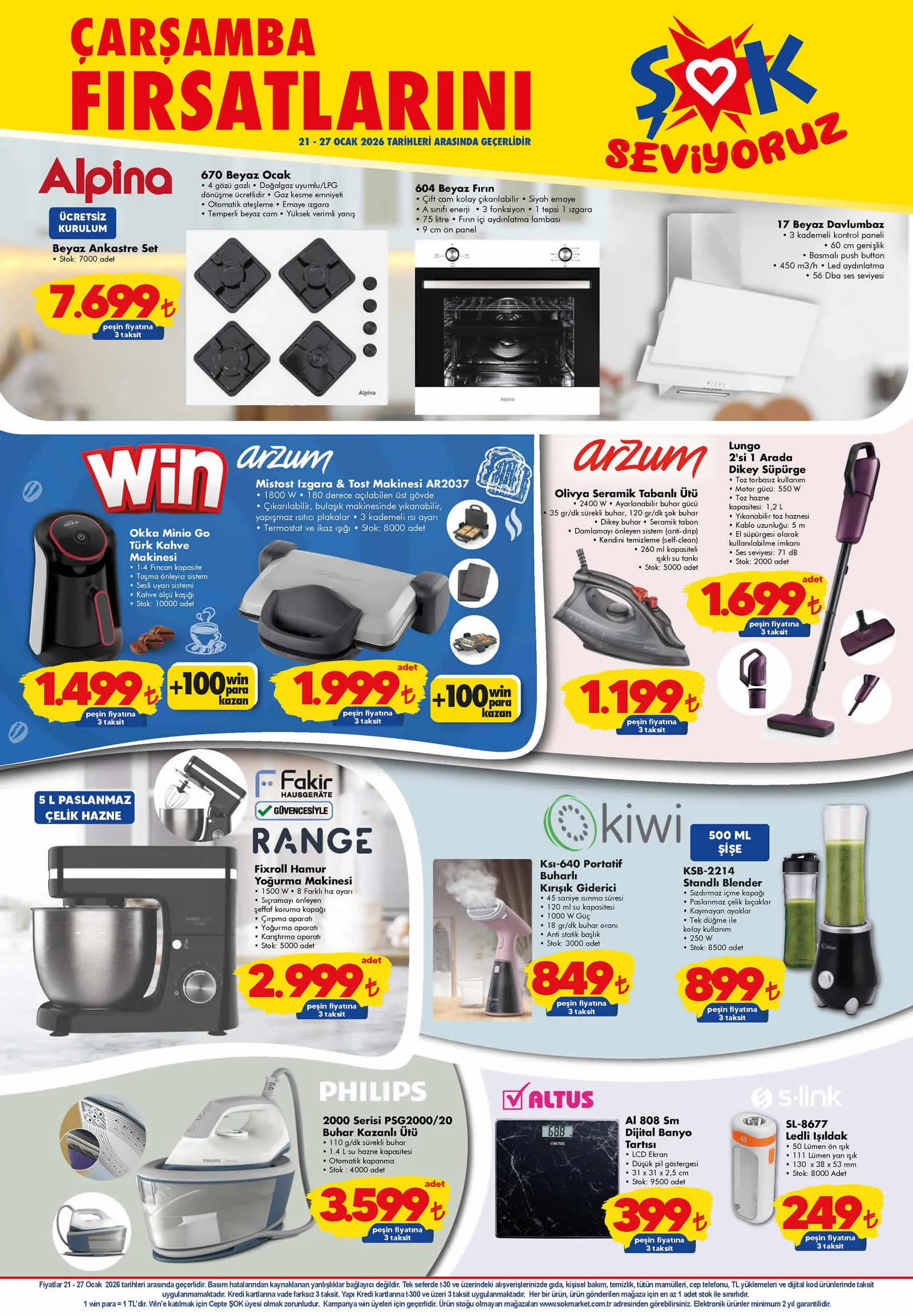 Ankastre set, seramik tabanlı ütü, dikey süpürge, hamur yoğurma makinesi, kırışık giderici, dijital banyo tartısı, desenli porselen kase, valiz, şarj kablosu, dikdörtgen tencere, Türk kahve makinesi ve ledli ışıldak gibi ürünlerin yer aldığı 21 Ocak tarihinden itibaren geçerli olacak ŞOK kataloğu yayınlandı.